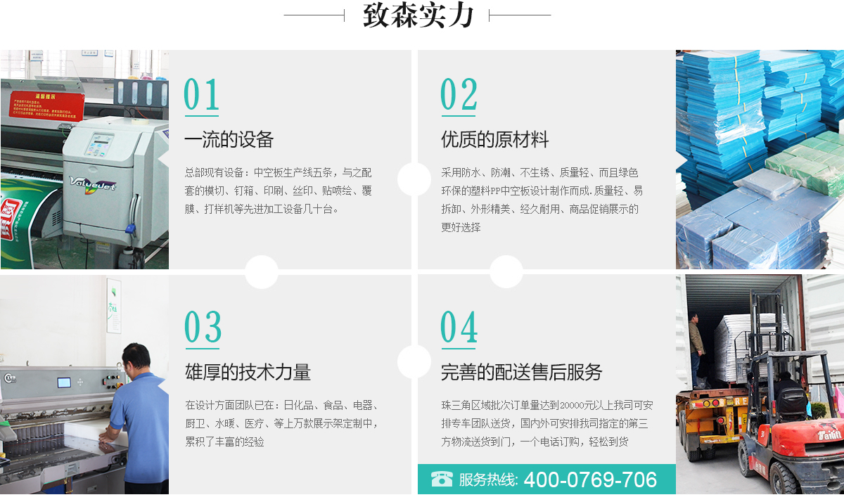 致森塑膠定位廣告行業(yè),專注空心塑料廣告板以及促銷展示架、商品展示盒等產(chǎn)品,優(yōu)秀設(shè)計團(tuán)隊以及專業(yè)的操作人員,標(biāo)準(zhǔn)化流水線作業(yè)和不斷引進(jìn)先進(jìn)設(shè)備,致森現(xiàn)有設(shè)備:中空板拉板設(shè)配五套,與之配套的模切、釘箱、印刷、絲印、貼噴繪、覆膜、打樣機(jī)等先進(jìn)加工設(shè)備幾十臺。
